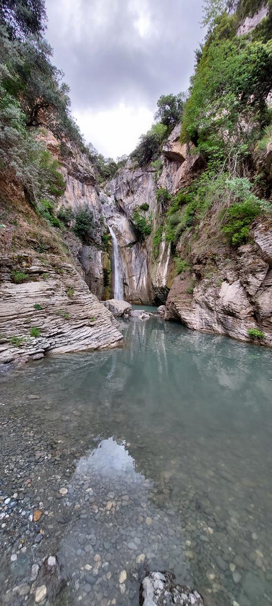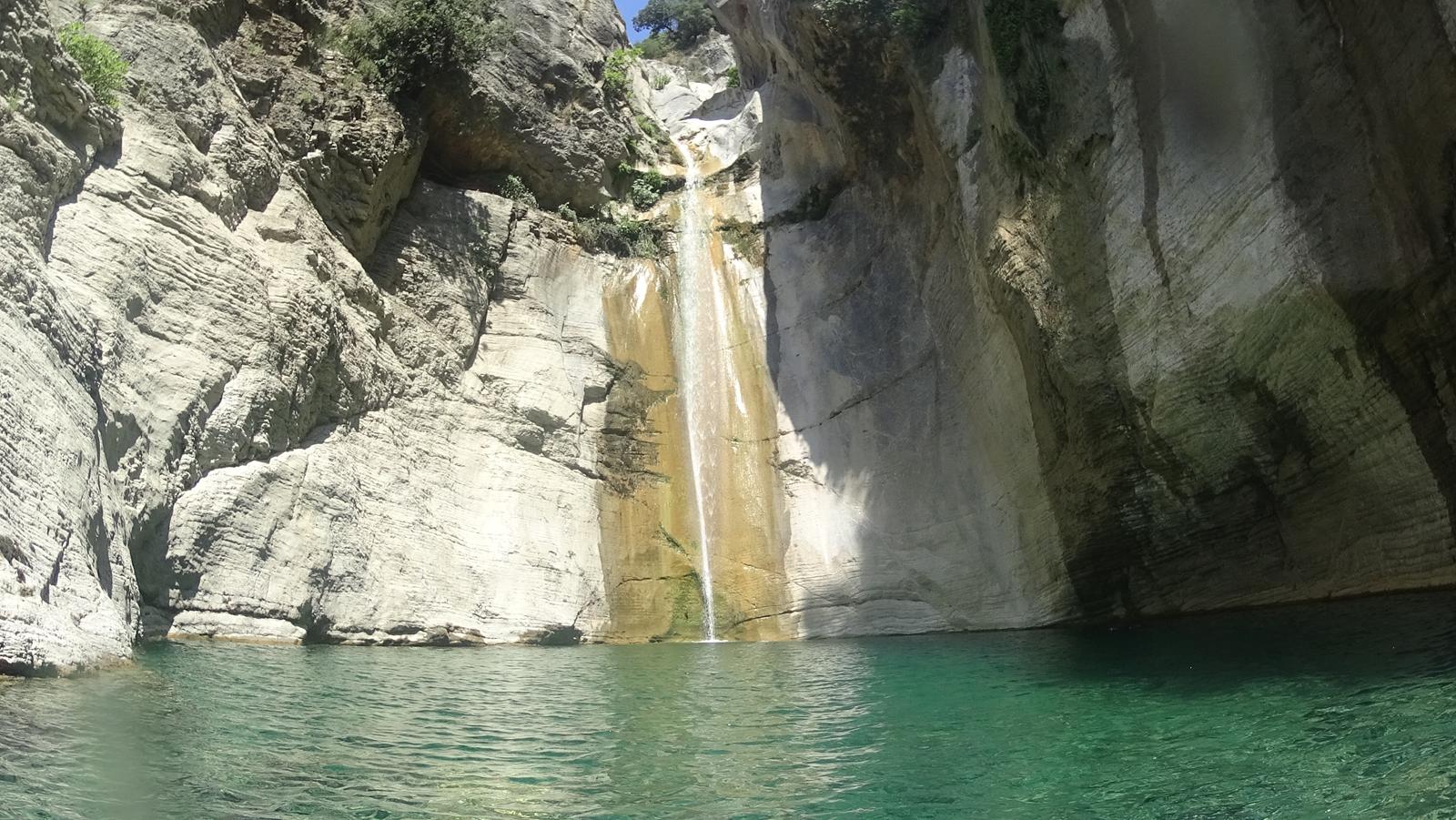 Στη γαλάζια λίμνη που σχηματίζει ο καταρράκτης θα κάνουμε (προαιρετικά για κάποιους) τις βουτιές μας στα παγωμένα νερά της.